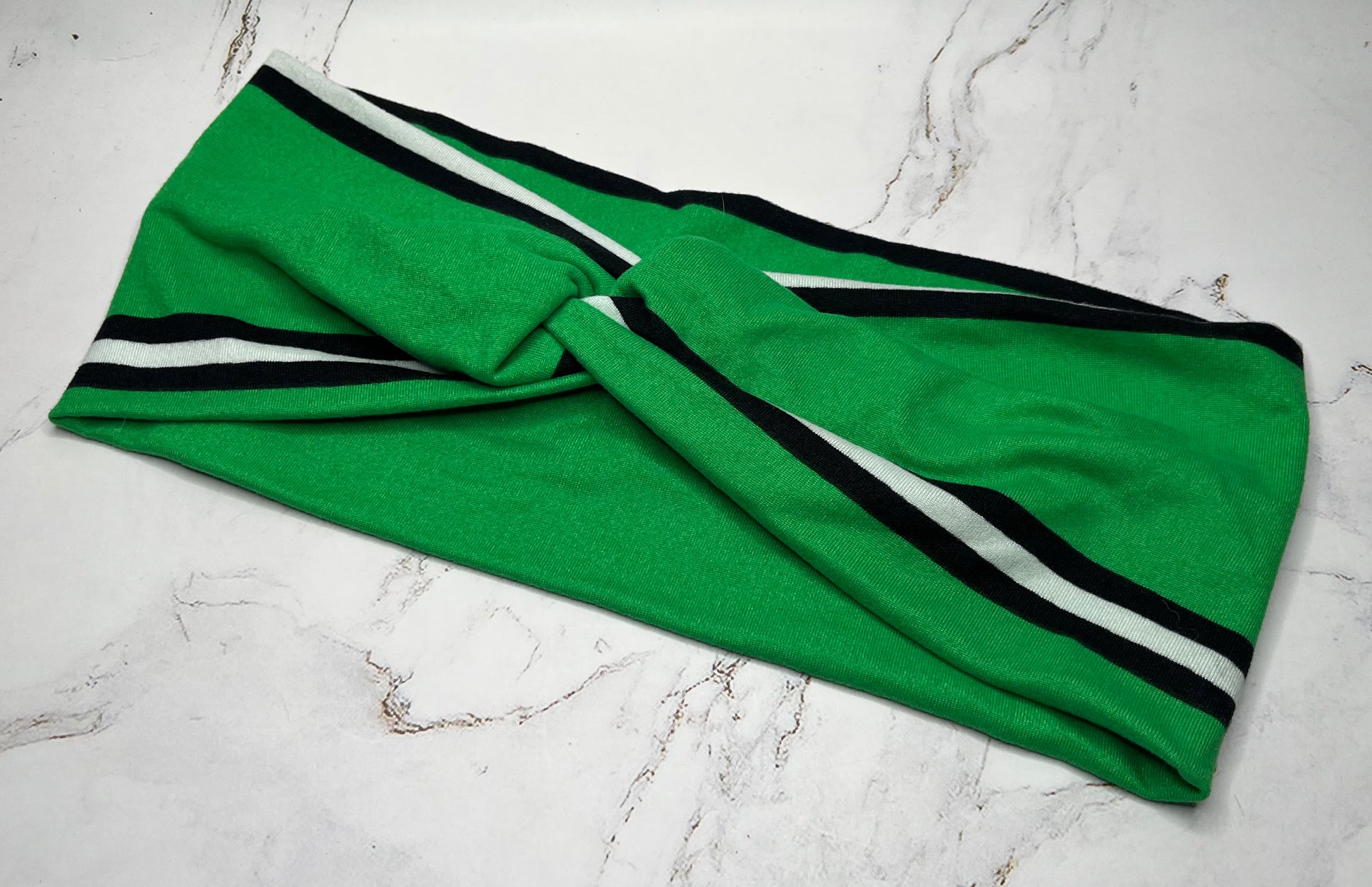 Bright green and white striped headband in amazingly soft double brushed polyester. This headband is perfect for wearing all day long without giving you a headache.