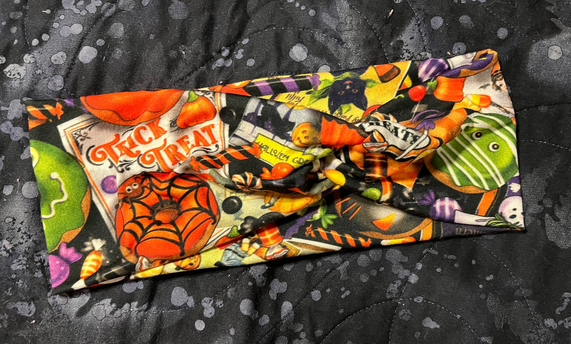 A perfect mix of all things Halloween make up this adorable twist front headband. A collage of images gives you so many different ways to share your love for the spooky season.