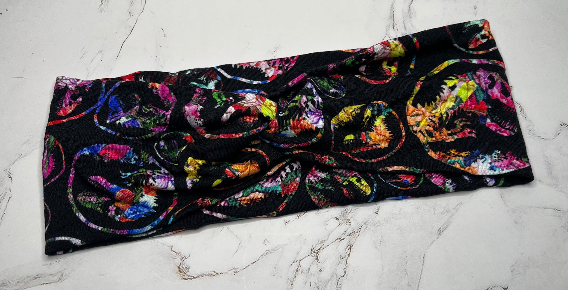 Life finds a way… in floral dinos. Made out of bamboo lycra this headband won't leave you with a headache at the end of the day.