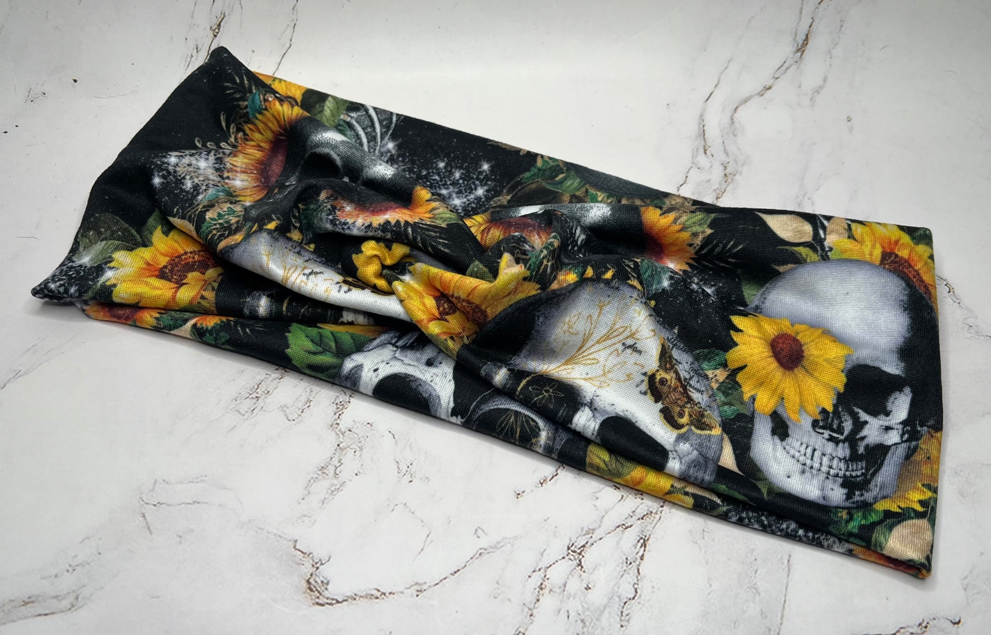 A little tough, a little pretty, this sunflower and skull headband is beautiful and tough.
